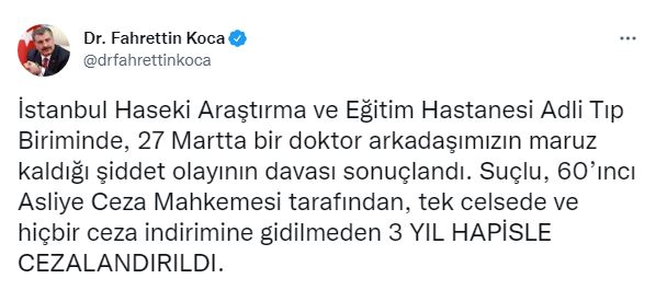 Bakan Koca resmi Twitter hesabından yaptığı paylaşımında, "İstanbul Haseki Araştırma ve Eğitim Hastanesi Adli Tıp Biriminde, 27 Martta bir doktor arkadaşımızın maruz kaldığı şiddet olayının davası sonuçlandı. Suçlu, 60’ıncı Asliye Ceza Mahkemesi tarafından, tek celsede ve hiçbir ceza indirimine gidilmeden 3 YIL HAPİSLE CEZALANDIRILDI" ifadelerini kullandı.