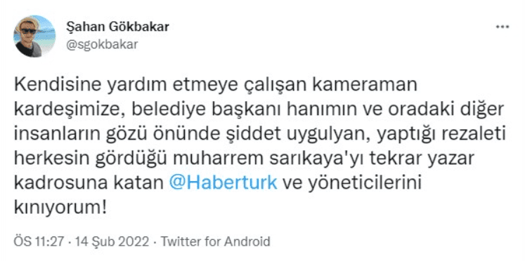 Şahan Gökbakar, "Kendisine yardım etmeye çalışan kameraman kardeşimize, belediye başkanı hanımın ve oradaki diğer insanların gözü önünde şiddet uygulayan, yaptığı rezaleti herkesin gördüğü Muharrem Sarıkaya'yı tekrar yazar kadrosuna katan @Haberturk ve yöneticilerini kınıyorum!" sözleriyle sitem etti.