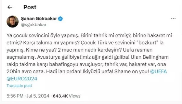 Şahan Gökbakar paylaşımında, ''Ya çocuk sevincini öyle yapmış. Birini tahrik mi etmiş?, birine hakaret mi etmiş? Karşı takıma mı yapmış? Çocuk Türk ve sevincini "bozkurt" la yapmış. Kime ne yaa? 2 mac men nedir kardeşim? Uefa resmen saçmalamış. Avusturya galibiyetimiz ağır geldi galiba! Ulan Bellingham rakip takima karşı babafingoyu avuçluyor; tahrik var, hakaret var, ona 20bin avro ceza. Hadi lan ordan! İkiyüzlü uefa! Shame on you!'' diye yazdı.