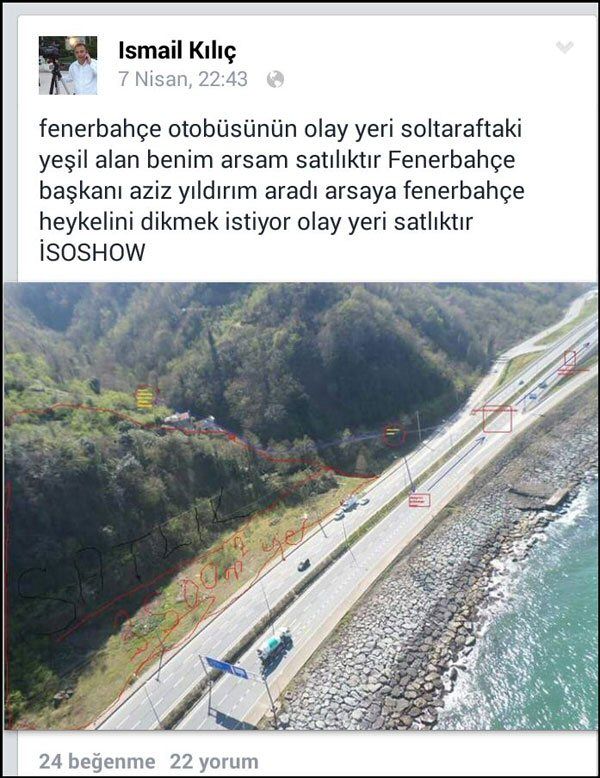 'Önce şaka mahiyetinde 'Fenerbahçe otobüsünün olay yeri sol taraftaki yeşil alan benim arsam satılıktır. Fenerbahçe Başkanı Aziz Yıldırım aradı arsaya Fenerbahçe heykelini dikmek istiyor. Olay yeri satılıktır' diye bir paylaşım yaptım. Daha sonra bu paylaşım ciddiye alındı ve neden olmasın? dedim.