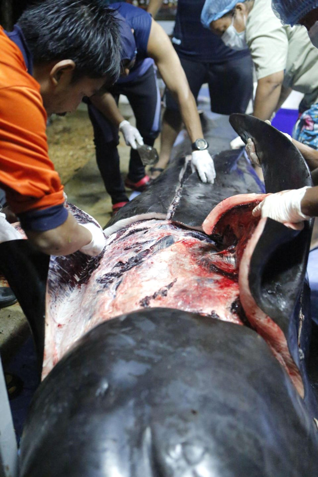 Küçük erkek pilot balinası deniz kurtarma ekipleri tarafından bulunduğunda kusmaya çalışıyordu. Balina öldükten sonra gerçekleştirilen otopsi sonucunu açıklayan Tayland Deniz ve Kıyı Kaynakları Departmanı, hayvanın midesinden 80 tane plastik poşet bulunduğunu tespit etti.