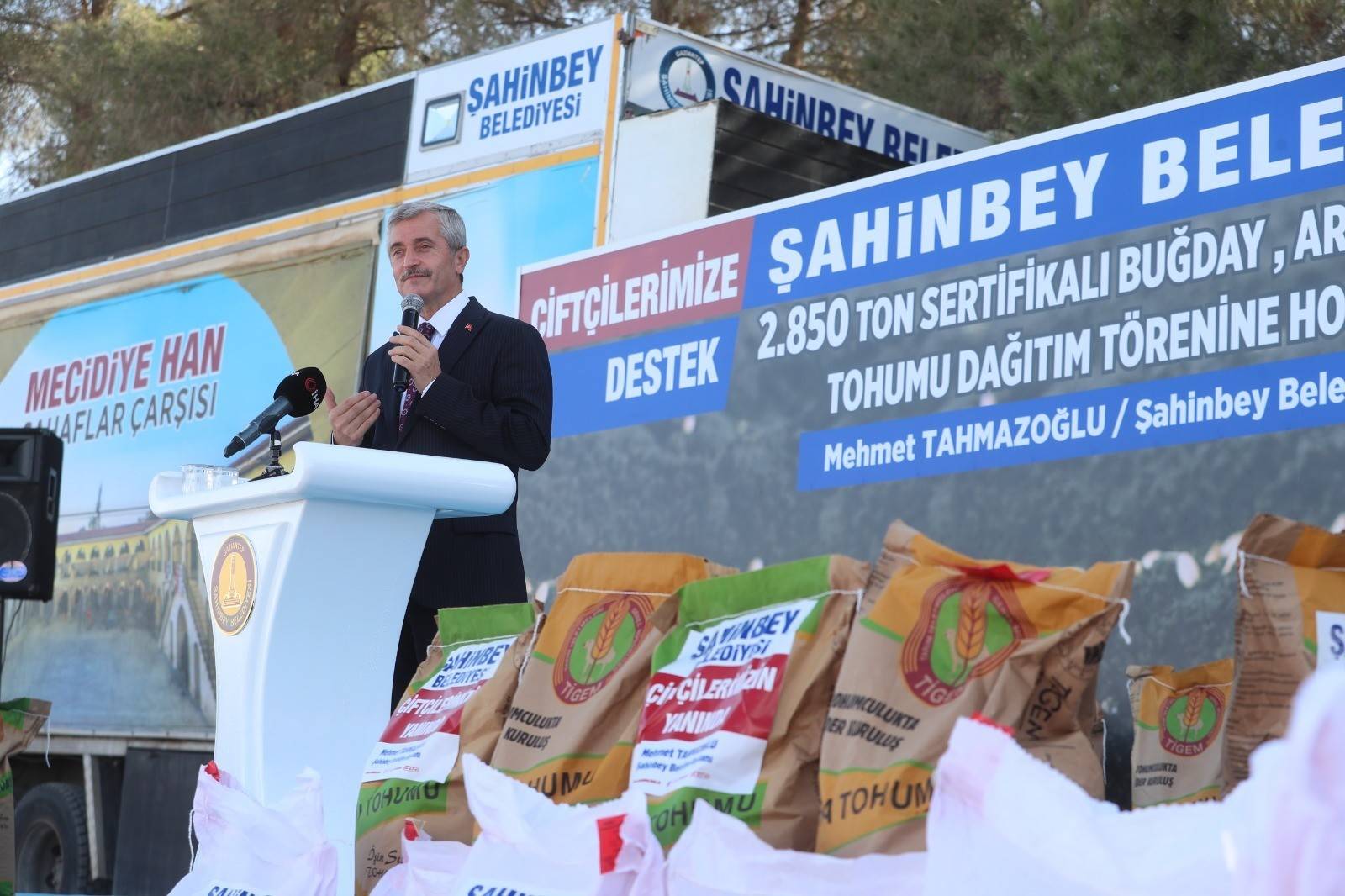 Üretimin artması için çiftçilere önemli destekler sağlayan Şahinbey Belediye Başkanı Mehmet Tahmazoğlu, bu desteğini arttırarak sürdürmeye devam ediyor. Daha önce çiftçilere 13.110 ton arpa, buğday ve mercimek, 10.070 ton gübre, 24.285 ton yem, 750.000 adet zeytin, 150.000 adet fıstık fidanı, 12.000.000 sebze-meyve fidesi, 283 aileye 3.656 adet küçük ve büyükbaş hayvanın yanı sıra 1’er ton yem desteğinde bulunan Başkan Mehmet Tahmazoğlu, çiftçilere şimdiye kadar binlerce tır destek sağladıklarını ifade etti.