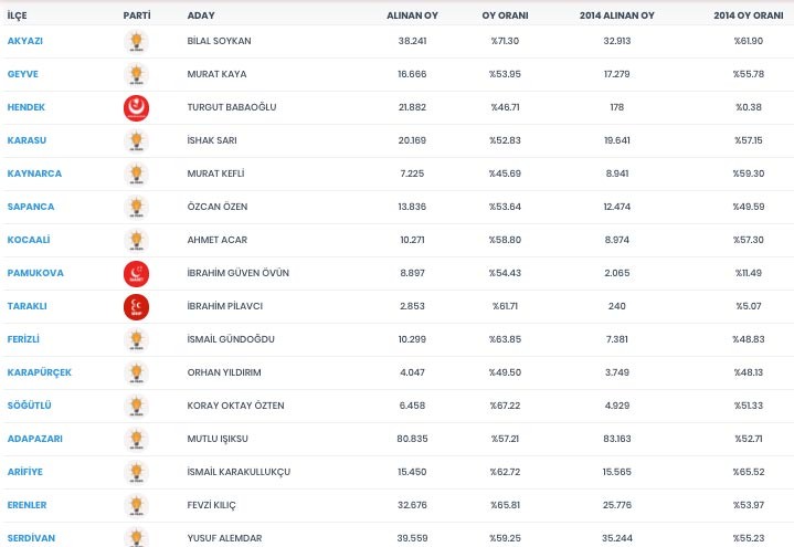 Sakarya ilçe seçim sonuçları 2019 son dakika YSK Sakarya ilçe seçim sonuçları