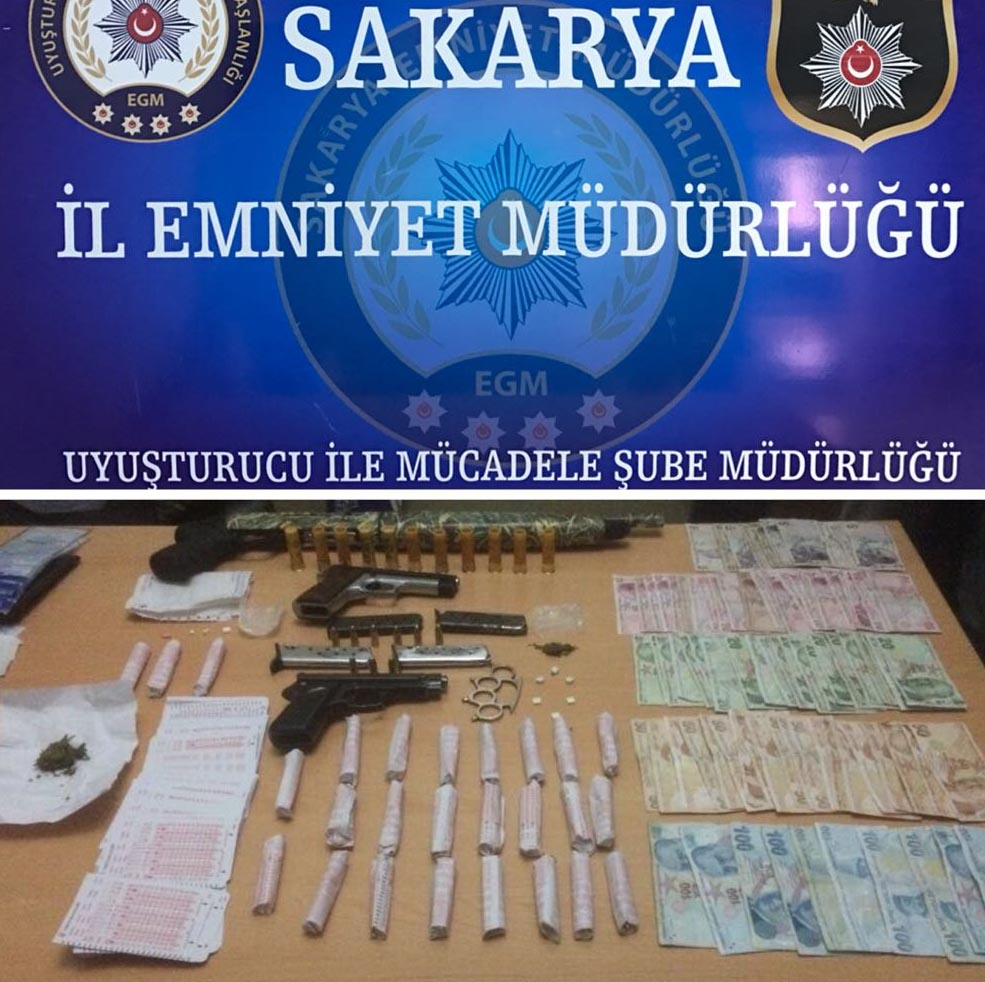 Sakarya'nın Akyazı İlçesi'nde takibe alınan uyuşturucu satıcıları polisin operasyonu ile yakalandı. 3 kişi gözaltına alınırken, 100 gram esrar, 9 uyuşturucu hap, 2 tabanca ve 1 tüfek ele geçirildi.