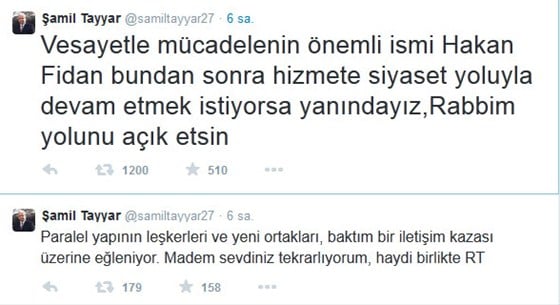 AK Parti Gaziantep Milletvekili Tayyar, görevinden istifa eden MİT Müsteşarı Hakan Fidan hakkındaki destek mesajının silinmesinin ‘kaza’ olduğunu açıklayarak mesajı yeniden yayınladı.