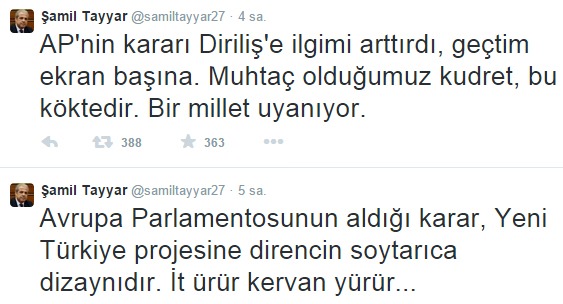 Tayyar, "Avrupa Parlamentosunun aldığı karar, yeni Türkiye projesine direncin soytarıca dizaynıdır. İt ürür, kervan yürür. AP'nin kararı Diriliş'e ilgimi arttırdı, geçtim ekran başına. Muhtaç olduğumuz kudret, bu köktedir. Bir millet uyanıyor" ifadelerini kullandı.