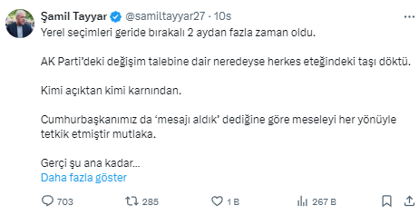 Ak parti eski milletvekili Şamil Tayyar bugün sosyal medya hesabından yaptığı açıklamada Ak Partiye sitemkâr sözler sarf etti.
