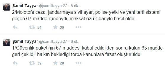 Tayyar, Twitter hesabı üzerinden, "Güvenlik Paketi'nin 67 maddesi kabul edildikten sonra kalan 63 madde geri çekildi, halkın beklediği torba kanunlara fırsat oluşturuldu. Molotofa ceza, jandarmaya sivil ayar, polise yetki ve yeni terfi sistemi geçen 67 madde içindeydi, maksat özü itibariyle hasıl oldu" ifadelerini kullandı.