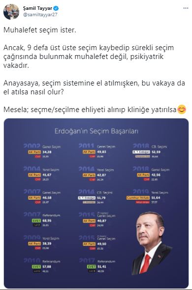 "Muhalefet seçim ister. Ancak, 9 defa üst üste seçim kaybedip sürekli seçim çağrısında bulunmak muhalefet değil, psikiyatrik vakadır. Anayasaya, seçim sistemine el atılmışken, bu vakaya da el atılsa nasıl olur? Mesela; seçme/seçilme ehliyeti alınıp kliniğe yatırılsa"