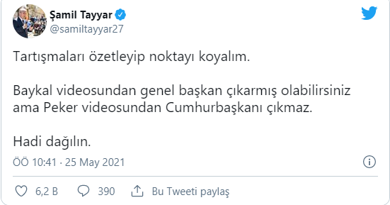 Muhalefet partilerine eleştiri yönelten Tayyar, "Tartışmaları özetleyip noktayı koyalım. Baykal videosundan genel başkan çıkarmış olabilirsiniz ama Peker videosundan Cumhurbaşkanı çıkmaz. Hadi dağılın" dedi.