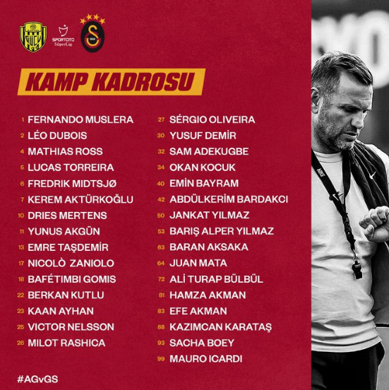 30 Mayıs Salı günü saat 20.00'de başlayacak karşılaşma öncesi Okan Buruk tam kadro olarak Ankara'ya hareket ederken, cezalı durumda bulunan Sergio Oliviera ve Zaniolo'yu da kadroya dahil etti.