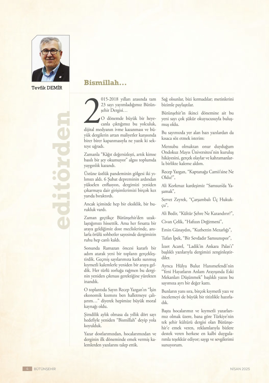 Dergiye emeği geçen tüm yazarlara, akademisyenlere ve destekçilere teşekkür eden Tevfik Demir, “Bütünşehir’in ruhu hep bizimleydi, şimdi yeniden okuyucularımızla buluşuyoruz” sözleriyle yeni dönemin heyecanını paylaştı.