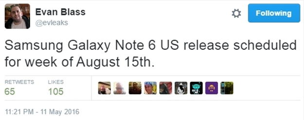 Mobil dünyasının güvenilir kaynaklarından @evleaks, Twitter hesabından Galaxy Note 6’nın çıkış tarihine açıklık getirdi.