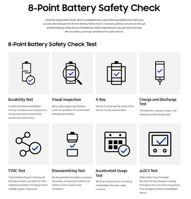 Röntgen (X-Ray) Testi: Röntgen cihazları ile pilin iç yapısı kontrol edilerek olağan dışı durumların tedarikçi tarafından kontrol edilmesi sürecine Samsung daha kapsamlı şekilde dahil oldu.