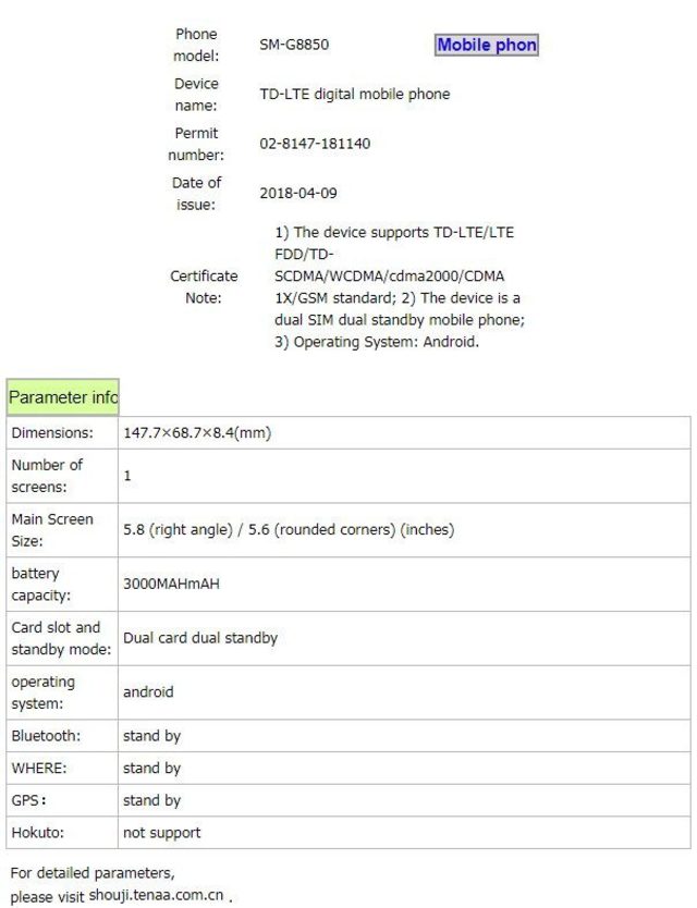 TENAA'nın web sitesinde ortaya çıkan Galaxy S9 Mini, SMG-8850 model numarasıyla deyim yerindeyse arz-ı endam ediyor. Sitede yazan bilgilere göre Galaxy S9 mini 5.8 inç büyüklüğünde Samsung'un İnfinity Display teknolojisini destekleyen bir ekrana sahip. Telefon gücünü ise 3000 mAh değerindeki bir bataryadan sağlıyor.