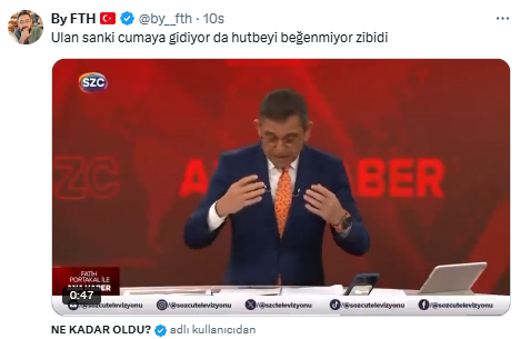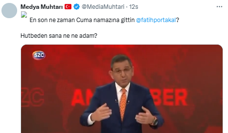 Sözcü TV sunucusu Fatih Portakal, bugün eda edilen Cuma namazındaki hutbede Diyanet'in 'zina' uyarısından rahatsız oldu. Hutbedeki ifadeleri çarpıtan Portakal, "Ne kafadasınız siz ya? Sizin aklınız nerede? Aklınız niye hep başka şeye çalışıyor?" ifadelerini kullandı. Diyanet işleri başkanının sadece Müslümanlara hitap ettiği hutbeden Fatih Portakal’ın neden rahatsız olduğu anlaşılamadı.