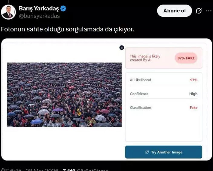Rezaletin perde arkası ise tam bir komediye dönüştü. İmamoğlu'nu destekleyen sitenin sahibi, görselin yapay zekayla üretildiğini itiraf ederek, "Siz bunu niye resmi hesaplarda kullandınız?" diyerek ekibi suçladı. CHP'li vekillerin ve resmi hesapların bile bu montajlı fotoğrafları gerçekmiş gibi servis etmesi, yalan siyasetinin ulaştığı son noktayı gözler önüne serdi. Sahte kalabalıklarla iktidar hayali kuranların foyası, teknik sorgulamalarla bir bir döküldü.