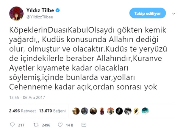Ünlü sanatçı Yıldız Tilbe, sosyal medyadan yaptığı açıklamada, "Köpeklerin duası kabul olsaydı gökten kemik yağardı. Kudüs konusunda Allah'ın dediği olur, olmuştur ve olacaktır. Kudüs de yeryüzü de içindekilerle beraber Allah'ındır. Kur'an ve ayetler kıyamete kadar olacakları söylemiş, içinde bunlarda var. Yolları Cehenneme kadar açık, oradan sonrası yok" ifadelerini kullandı.