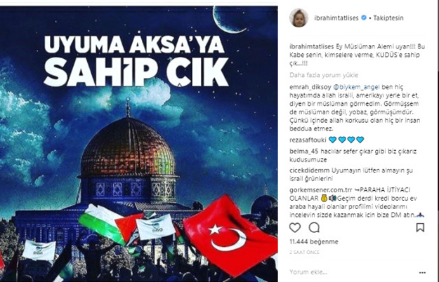 Ünlü sanatçı İbrahim Tatlıses de ABD'nin Kudüs'ü İsrail'in başkenti kabul etmesine sessiz kalınmamasını isteyerek, "Ey Müslüman Alemi uyan" dedi. Instagram hesabından "Uyuma, Aksa'ya sahip çık" yazılı bir görsel paylaşan İbrahim Tatlıses, "Ey Müslüman Alemi uyan!!! Bu Kabe senin, kimselere verme, Kudüs'e sahip çık...!" ifadelerini kullandı.