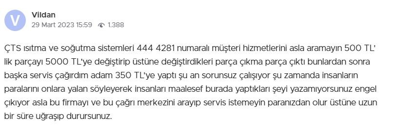 Vildan isimli kullanıcı, 500 TL'lik bir parçanın 5000 TL'ye değiştirilmek istendiğini ve üstelik değiştirilen parçanın kullanılmış çıktığını iddia etti. Aynı kullanıcının başka bir servis çağırarak 350 TL'ye sorunu çözdürdüğü ve şu anda hiçbir sorun yaşamadığını belirtti. Bu durum, kullanıcıları bu şirketin çağrı merkezini aramamaları konusunda uyarıyor.
