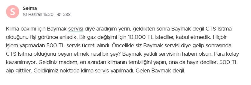 Selma isimli kullanıcı ise Baymak servisi olduğunu düşündüğü bir numarayı arayarak klima bakımı için hizmet talep etti. Ancak gelen teknik ekibin CTS Isıtma'ya ait olduğunu fişi görünce anladığını ve gaz değişimi için 10.000 TL talep edildiğini belirtti. Kullanıcı, hiçbir işlem yapılmadan 500 TL servis ücreti alındığını ifade etti.