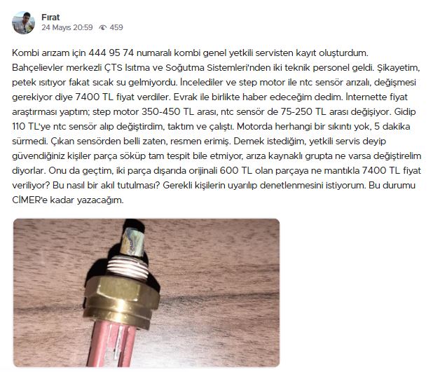 Fırat isimli kullanıcı ise kombi arızası için 444 95 74 numaralı kombi genel yetkili servisinden kayıt oluşturdu. Gelen teknik ekibin step motor ve ntc sensör değişimi için 7400 TL fiyat verdiğini, ancak bu parçaları daha uygun fiyatlara temin edip sorunu kendisinin çözdüğünü belirtti. Kullanıcı, yetkili servis adı altında güvenilen kişilerin parça söküp tam tespit bile yapmadığını iddia etti.