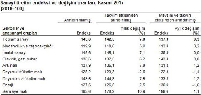 Takvim etkisinden arındırılmış sanayinin alt sektörleri (2010=100 temel yıllı) incelendiğinde; 2017 yılı Kasım ayında madencilik ve taşocakçılığı sektörü endeksi bir önceki yılın aynı ayına göre yüzde 5,9, imalat sanayi sektörü endeksi yüzde 7,1 ve elektrik, gaz, buhar ve iklimlendirme üretimi ve dağıtımı sektörü endeksi yüzde 6,7 arttı.