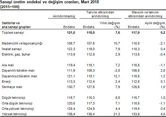 Türkiye İstatistik Kurumu Mart 2018'e ilişkin Sanayi Üretim Endeksi raporunu açıkladı. Sanayi üretimi bir önceki yılın aynı ayına göre yüzde 7,6 arttı. Sanayinin alt sektörleri (2015=100 referans yıllı) incelendiğinde, 2018 yılı Mart ayında madencilik ve taşocakçılığı sektörü endeksi bir önceki yılın aynı ayına göre yüzde 10,7, imalat sanayi sektörü endeksi yüzde 7,9 ve elektrik, gaz, buhar ve iklimlendirme üretimi ve dağıtımı sektörü endeksi yüzde 2,9 arttı.