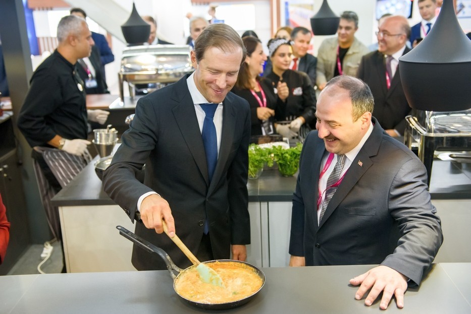 INNOPROM 2019 Türkiye Milli Fuar Alanı açılış törenine katılan Sanayi ve Teknoloji Bakanı Mustafa Varank, Rus mevkidaşı Denis Manturov'a menemen ikram etti.