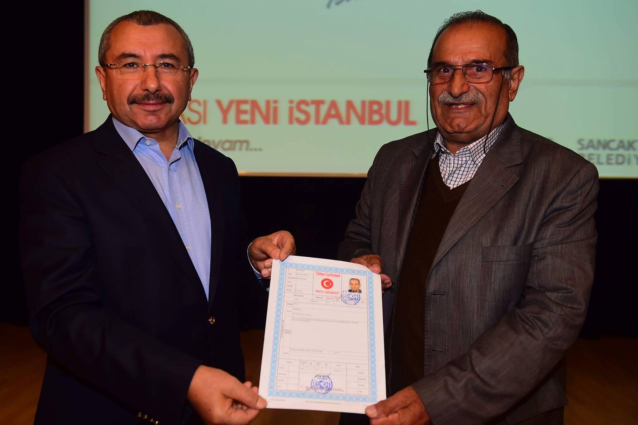Sancaktepe Kadir Topbaş Kültür ve Sanat Merkezi’nde düzenlenen törende, Sancaktepe Belediye Başkanı İsmail Erdem uzun yıllar tapu sorunu yaşayan vatandaşların tapularını dağıttı.