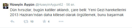 Son olarak CHP Tunceli Milletvekili Hüseyin Aygün’ün, “Dün hırsızlar, bugün katiller aklandı, çare belli: Yeni Gezi hareketlerini 2013 Haziranı'ndan daha kitlesel olarak örgütlemek, bunu başarmak” sözleri ise sandıktan umudu kesen CHP’nin nerede çare aradığını gösteriyor.