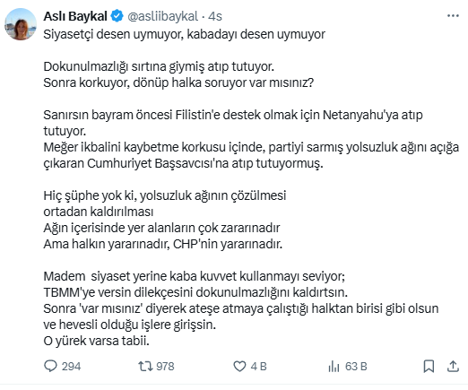 Sanırsın ki Filistin’e zulmeden Netanyahu’ya bakıyor! Aslı Baykal’dan Özgür Özel’e mesaj var