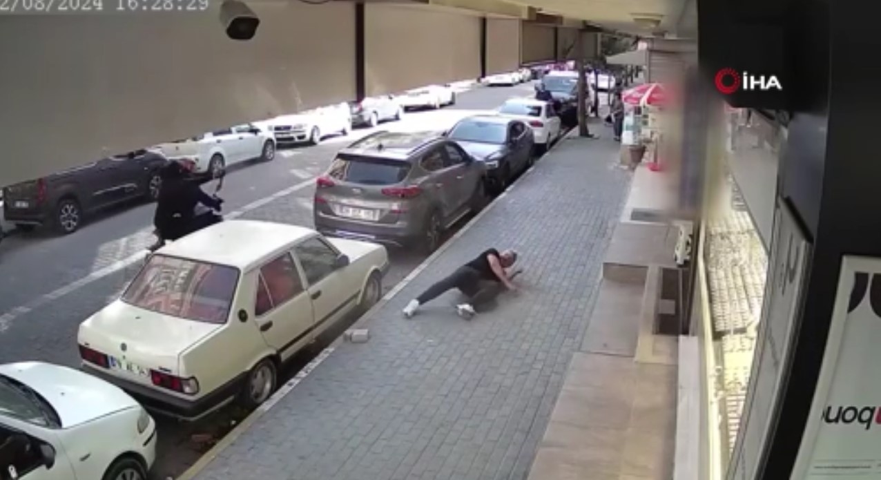Öte yandan, saldırı anı saniye saniye güvenlik kamerasına yansıdı. Görüntülerde, saldırı esnasında dükkanın önünden geçen bir adamın kendini yere atarak son anda kurtulduğu anlar yer aldı.