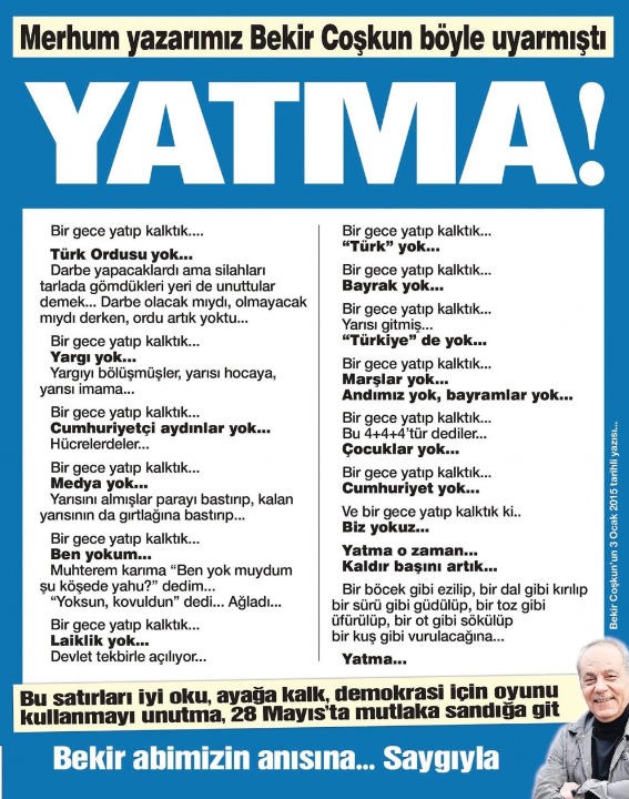 Sözcü gazetesi, "Merhum yazarımız Bekir Coşkun böyle uyarmıştı: Yatma" başlığını kullandı.