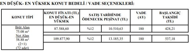 Peşinat ve Vade Seçenekleri:%12 peşinat bedeli için 180 ay vade