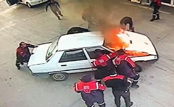 Olay, öğle saatlerinde Sigorta Mahallesi'nde bulunan bir akaryakıt istasyonunda meydana geldi. Bir sürücü, otomobiline LPG dolumu yapmak için istasyona geldi. Görevli yakıt doldurduğu sırada otomobilin motor bölümü bilinmeyen nedenle alev aldı. İstasyon görevlileri, yakıt dolumunu kesip yangın söndürme tüpleriyle alevlere müdahale etti. Görevlilerin müdahalesiyle söndürülen yangın paniğe neden olurken, yaşananlar güvenlik kameralarına yansıdı.