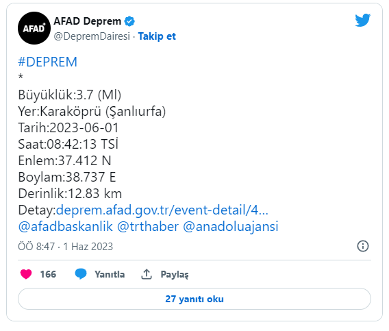 İçişleri Bakanlığı Afet ve Acil Durum Yönetimi Başkanlığının internet sitesinden alınan bilgiye göre, sabah saat 08.42’de Karaköprü ilçesinde 3.7 büyüklüğünde bir deprem meydana geldi. AFAD, depremin yerin 12.83 kilometre derinliğinde kaydedildiğini duyurdu.