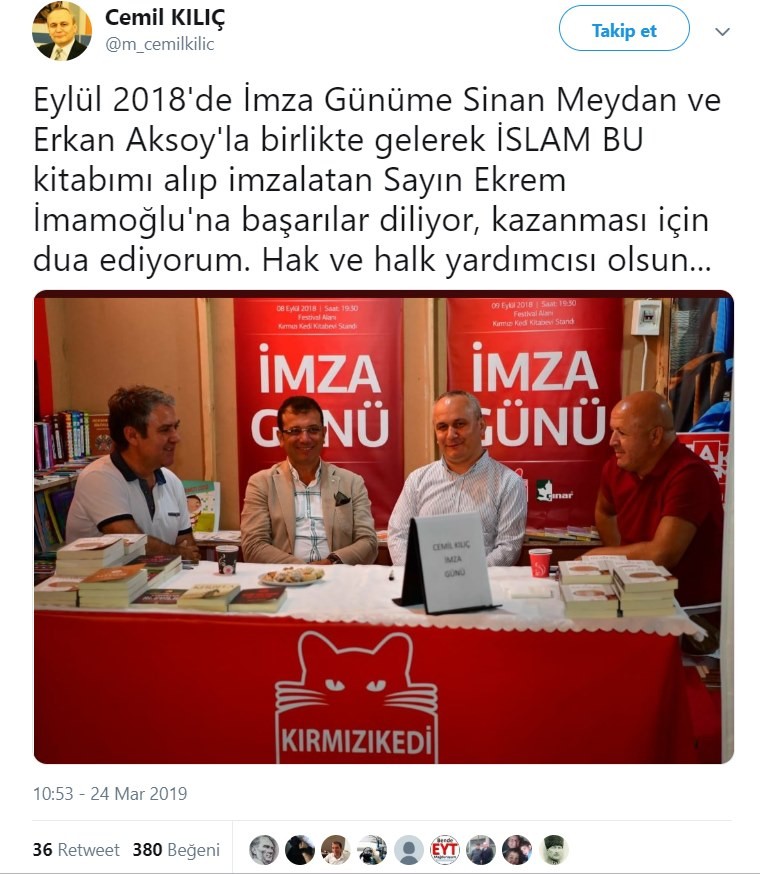 CHP'li İmamoğlu'nun kendisini desteklemek için imza gününde standına geldiğini unutmayan Cemil Kılıç, sosyal medya hesabından "Eylül 2018'de İmza Günüme Sinan Meydan ve Erkan Aksoy'la birlikte gelerek İSLAM BU kitabımı alıp imzalatan Sayın Ekrem İmamoğlu'na başarılar diliyor, kazanması için dua ediyorum. Hak ve halk yardımcısı olsun..." ifadesiyle kendisinin de İmamoğlu'nu desteklediğini söyledi.