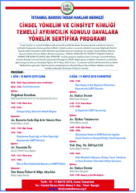 Müslüman Türk milletinin baş belası LGBTİ’li sapkınlara bir destek de en fazla sayıda avukatı bünyesinde barındıran İstanbul Barosu’ndan geldi. Daha önce Türkiye’nin en büyük üç barosundan ikisi olan Ankara ve İzmir’de LGBTİ Hakları Merkezi’nin kurulmasının ardından İstanbul Barosu da sapkın derneklerle iş birliğine gitti. İstanbul Barosu İnsan Hakları İzleme Merkezi’nin, sapkınları bünyesinde barındıran KAOS GL ve SPoD isimli dernekler ile “Cinsel Yönelim ve Cinsiyet Kimliği Temelli Ayrımcılık Konulu Davalara Yönelik Sertifika Programı” düzenlemek için harekete geçti. 10-11 Mayıs tarihleri arasında İstanbul Barosu’nun ev sahipliğinde gerçekleşecek programda LGBTİ sapkınlığını meşru hale getirecek birçok konunun ele alınacağı öğrenildi.