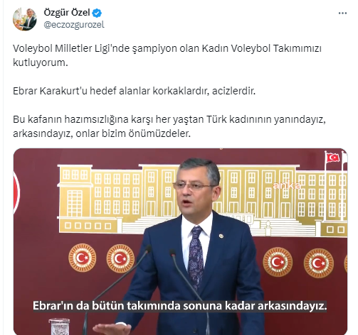 CHP Grup Başkanı Özgür Özel, eşcinsel sapkın Ebrar Karakurt'a destek verip, Akit Medya Grubu'nu hedefe koydu.