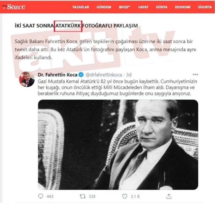 Sözcü, Mustafa Kemal Atatürk’ün ölüm yıl dönümü olan 10 Kasım’da, yaptığı bir haberde ‘Atatkürk’ ifadelerine yer verdi.