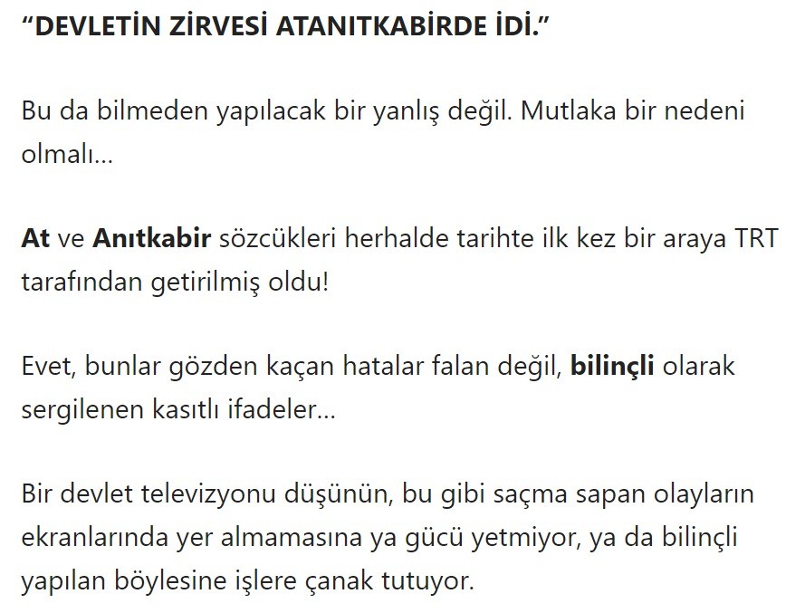 “At’ ve ‘Anıtkabir’ sözcükleri herhalde tarihte ilk kez bir araya TRT tarafından getirilmiş oldu” ifadelerine yer veren Çölaşan’a bizim de cevabımız şu şekilde: