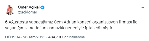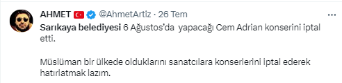 Melih Gökçek'in uyarısı, karşılık buldu. Gökçek'in paylaşımından bir gün sonra MHP'li Sarıkaya Belediye Başkanı Ömer Açıkel, konserin iptal edildiğini duyurdu. Başkan Açıkel, "6 Ağustos’ta yapacağımız Cem Adrian konseri organizasyon firması ile yaşadığımız anlaşmazlık nedeni ile iptal edilmiştir" ifadelerini kullandı.