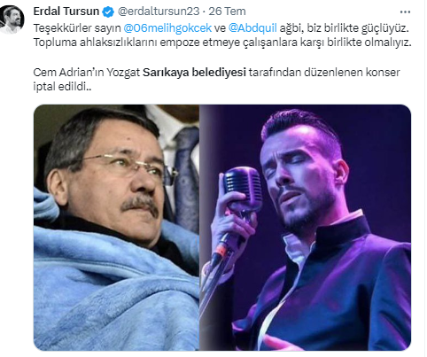 Ankara Büyükşehir Belediyesi eski Başkanı Melih Gökçek, Cem Adrian'ın MHP'li Sarıkaya Belediyesi'nin etkinliğinde konser vereceğini öğrenince, Twitter hesabından paylaşımda bulundu. Gökçek, "İnanamıyorum… Ama merak etmeyin… Buna müsaade etmeyecek sorumlu yiğit insanlar var. Yarını bekleyin inşallah…" dedi.