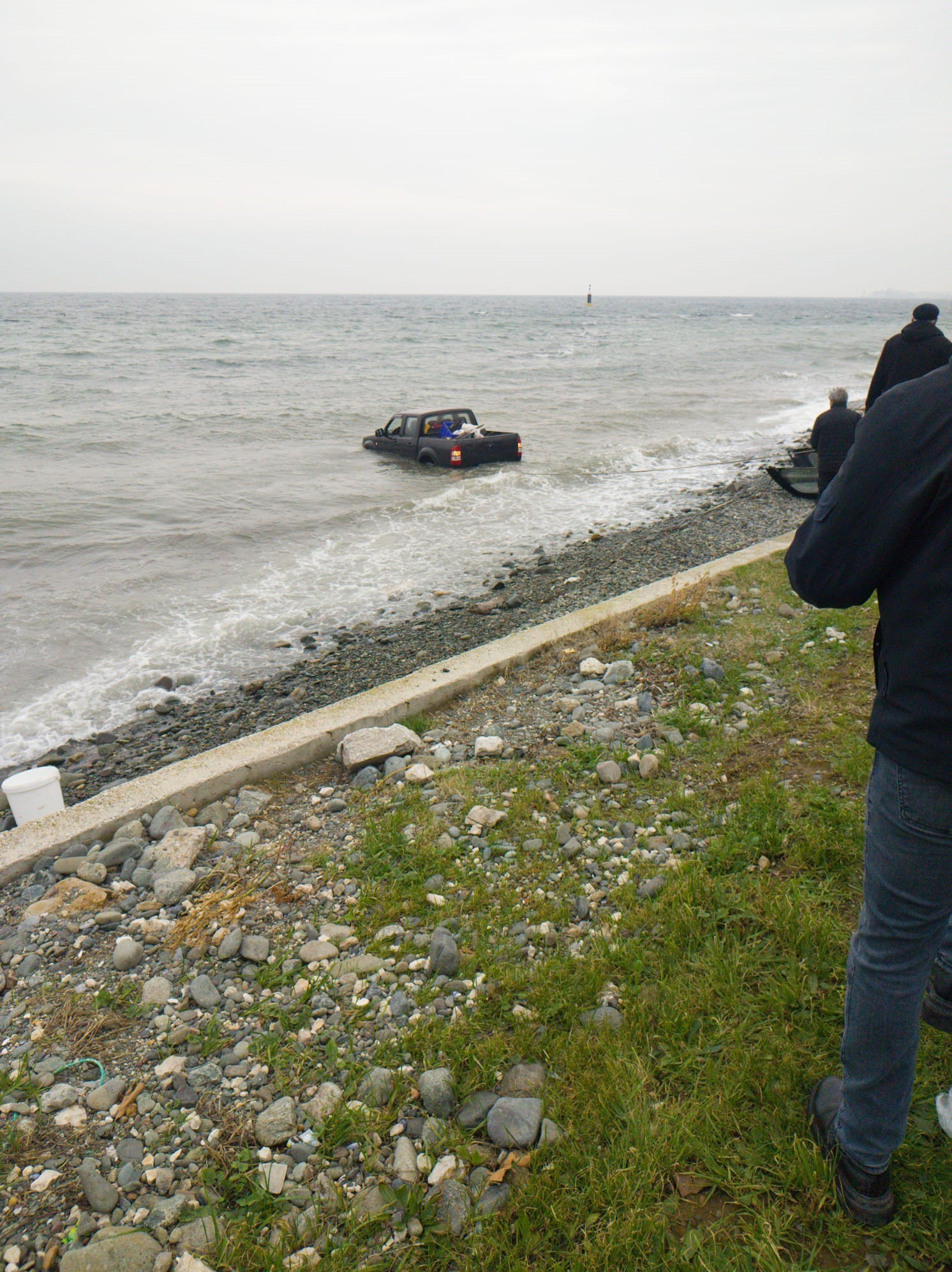 Denize düşen araç çekici ve itfaiye ekipleri tarafından çıkartıldı.