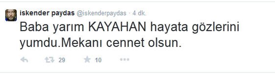 Kayahan'ın ölüm haberini Twitter'dan duyuran bir diğer isim ise İskender Paydaş oldu: