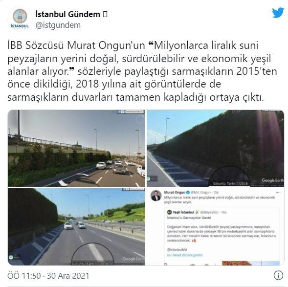 İBB Sözcüsü Murat Ongun'un "Milyonlarca liralık suni peyzajların yerini doğal, sürdürülebilir ve ekonomik yeşil alanlar alıyor" sözleriyle paylaştığı sarmaşıkların 2015’ten önce dikildiği, 2018 yılına ait görüntülerde de sarmaşıkların duvarları tamamen kapladığı belirlendi.