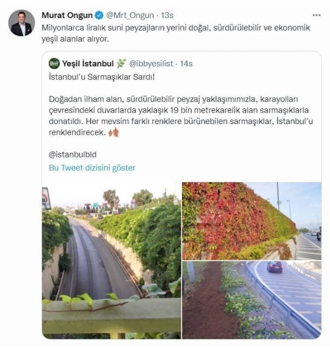 Başta metro projeleri olmak üzere her fırsatta başka bir icraati kendilerinin yaptığını iddia eden İBB, bu kez sarmaşıklara göz koydu. İBB Sözcüsü Murat Ongun'un "Milyonlarca liralık suni peyzajların yerini doğal, sürdürülebilir ve ekonomik yeşil alanlar alıyor" sözleriyle paylaştığı sarmaşıkların 2015’ten önce dikildiği, 2018 yılına ait görüntülerde de sarmaşıkların duvarları tamamen kapladığı ortaya çıktı.