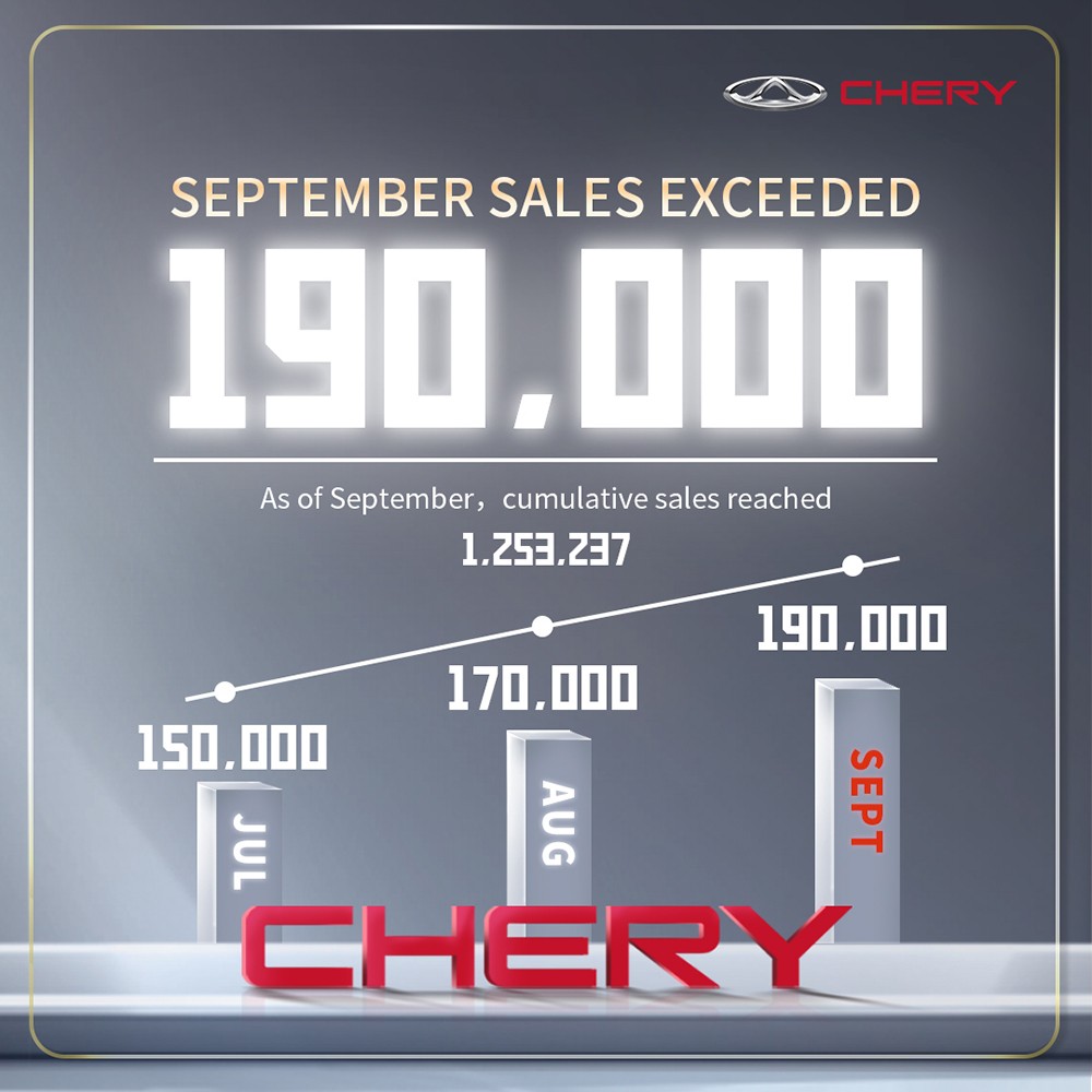 Chery Group, Eylül 2023’te, yıllık %30,7 artışla 190.080 araç satarak ilk kez aylık satışlarında 190.000 adedi geride bıraktı ve bir rekor daha kırmış oldu. Şirket, Ocak-Eylül 2023 döneminde, bir önceki yıla göre satışlarını %40,2 artırarak 1.253.237 araca ulaştı. Ayrıca Chery’nin eylül ayındaki satışları, yıllık %20,4 artışla 136.041 araca yükselirken ocak-eylül döneminde yıllık %33,8 artışla 909.374 araç satışı gerçekleşti. Tüm bu rakamlar doğrultusunda Chery Grubu üçüncü çeyrekte “Üçlü Sıçrama” kaydetti. Aylık satışlar sürekli olarak 150.000, 170.000 ve 190.000’in üzerinde araçla yeni rekorlar kırdı. İlk üç çeyreğin kümülatif satışları şimdiden geçen yılın yıllık toplamını aştı.