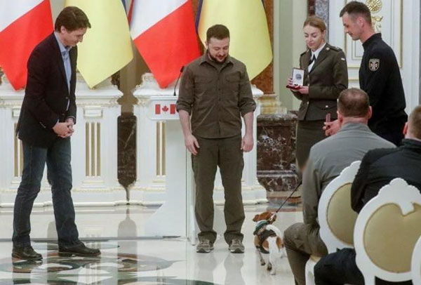 Ayrıca, dün Ukrayna'ya sürpriz bir ziyaret gerçekleştiren ve toplantıda hazır bulunan Kanada Başbakanı Justin Trudeau ile de bir araya geldi. Trudeau, Patron'a verecek bir yiyecek için ceplerini ararken görüntülendi.Ukrayna Devlet Acil Servisleri tarafından yayınlanan bir Telegram gönderisinde, "Sayın Trudeau, onun en sevdiği peynirden bir parça bulamamasına rağmen, Patron Ukrayna'nın gerçek bir dostuyla tanıştığı için son derece mutluydu" denildi. Diğer taraftan, Zelenski Ukraynalı mayın imha ateş teknisyenlerine de madalya verdi. Reuters'in bildirdiğine göre, bunlar arasında Patron'un sahibi Sivil Koruma Servisi'nden Binbaşı Myhailo Iliev de vardı.